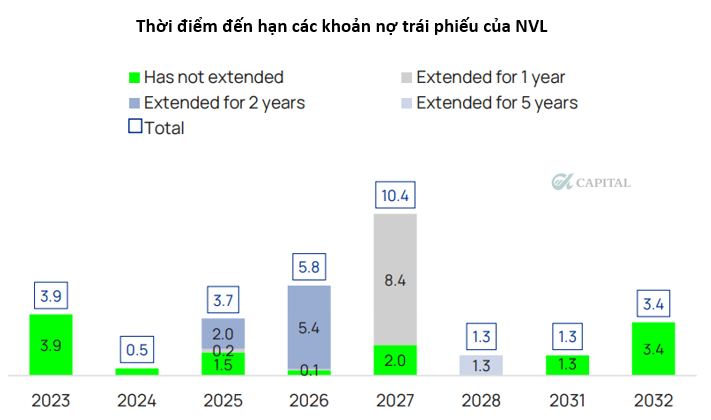 - Trong các tháng cuối năm, NVL có 1,500 tỷ VND trái phiếu đến hạn, trong khi đó, đối với các khoản nợ tái cơ cấu phần lớn đã được chuyển qua sau năm 2028 (năm 2027 – 2028 sẽ là giai đoạn căng thẳng nhất đối với phần trái phiếu của NVL)