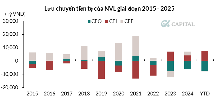 - Hoạt động kinh doanh chưa có dấu hiệu khởi sắc trở lại, CFO liên tục âm qua nhiều năm, tính đến 6 tháng 2025 tiếp tục âm 7,456 tỷ VND do phải chi trả các khoản phải trả lớn. Hoạt động kinh doanh âm nặng khiến NVL tiếp tục phải bán tài sản để cơ cấu dòng tiền.