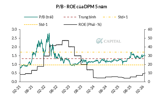 • DPM đang được giao dịch với P/B là 1.73, cao hơn trung bình 5 năm 23%. P/B mục tiêu cho năm 2026 quay về vùng P/B cuối 2021 (ROE tương đương giai đoạn này) là 2.2x tương đương giá mục tiêu là 36,700 VND/cp (upside 27%). Cần lưu ý upside của DPM thấp hơn do hiệu quả kinh doanh kém hơn tương đối so với DCM (ROE thấp hơn hơn hẳn). Upside của DPM có thể tốt hơn nếu tăng trưởng lợi nhuận cao hơn kì vọng.