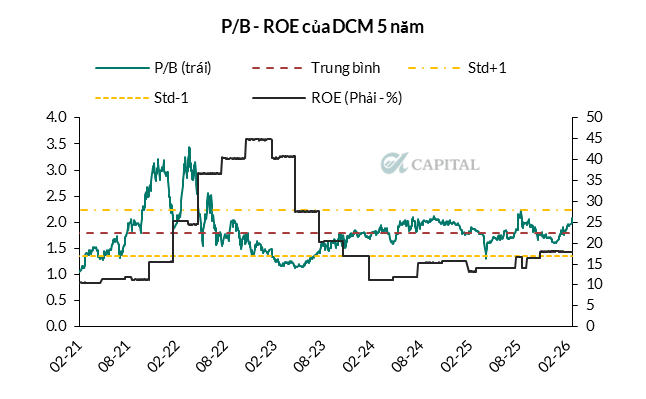 • DCM đang được giao dịch với P/B là 2.05, cao hơn trung bình 5 năm 13%. P/B mục tiêu cho năm 2026 quay về đỉnh P/B năm 2022 (ROE tương đương giai đoạn này) là 3.4x tương đương giá mục tiêu là 69,900 VND/cp (upside 65%)