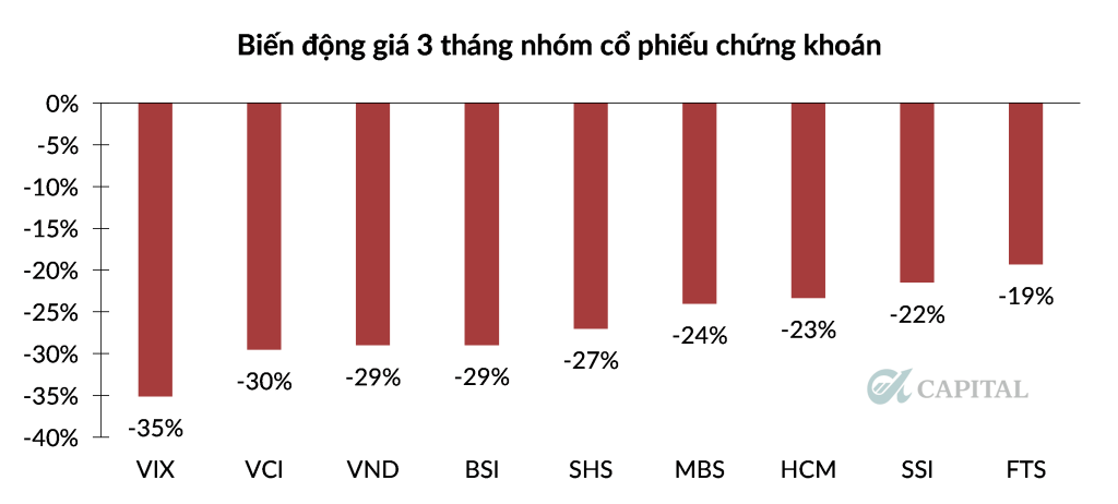 Trong ba tháng trở lại đây, nhóm dịch vụ chứng khoán chứng kiến mức điều chỉnh mạnh nhất trong nhiều nhóm ngành. Đa số cổ phiếu giảm 25–35%, thậm chí một số mã giảmsâu hơn mức sụt giảm chung của VN-Index.