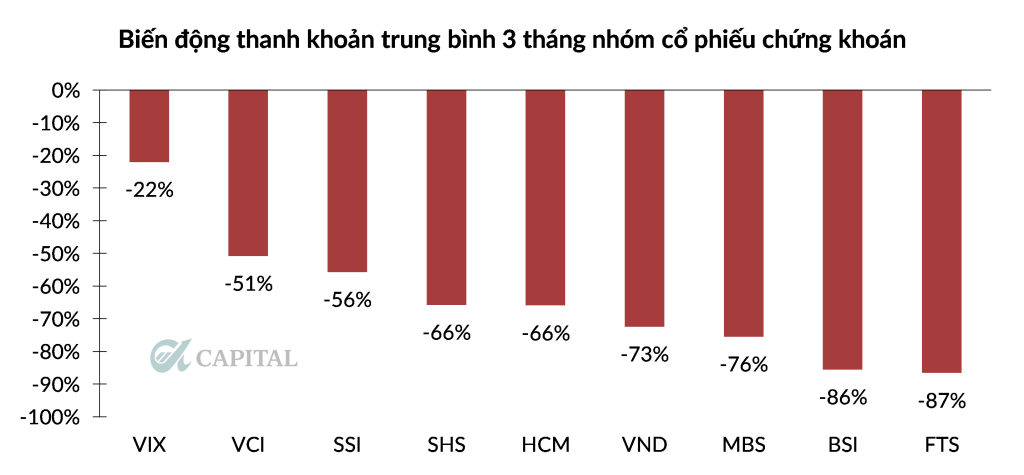 Doanh thu môi giới phụ thuộc trực tiếp vào giá trị giao dịch của toàn thị trường. Khi thanh khoản giảm 40–60%, doanh thu môi giới gần như giảm tương ứng.