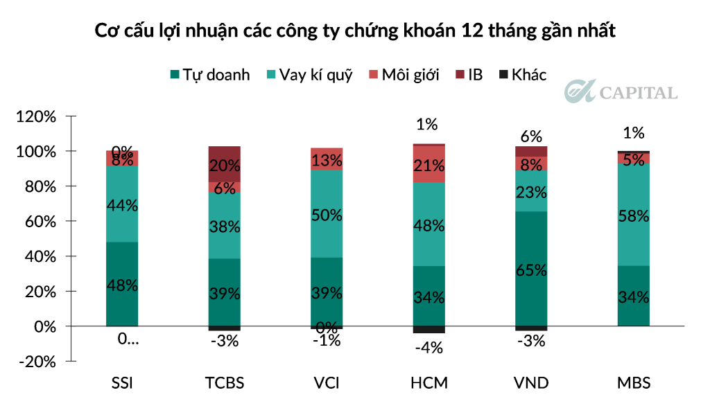 Các công ty có tỷ trọng tự doanh lớn sẽ chịu ảnh hưởng mạnh nhất: VND, VCI, SSI. Đây đều là các doanh nghiệp có danh mục tài sản tài chính quy mô lớn, biến động mạnh theo thịtrường. Khi thị trường giảm điểm, lợi nhuận tự doanh ngay lập tức bốc hơi, thậm chí rơi vào lỗ.