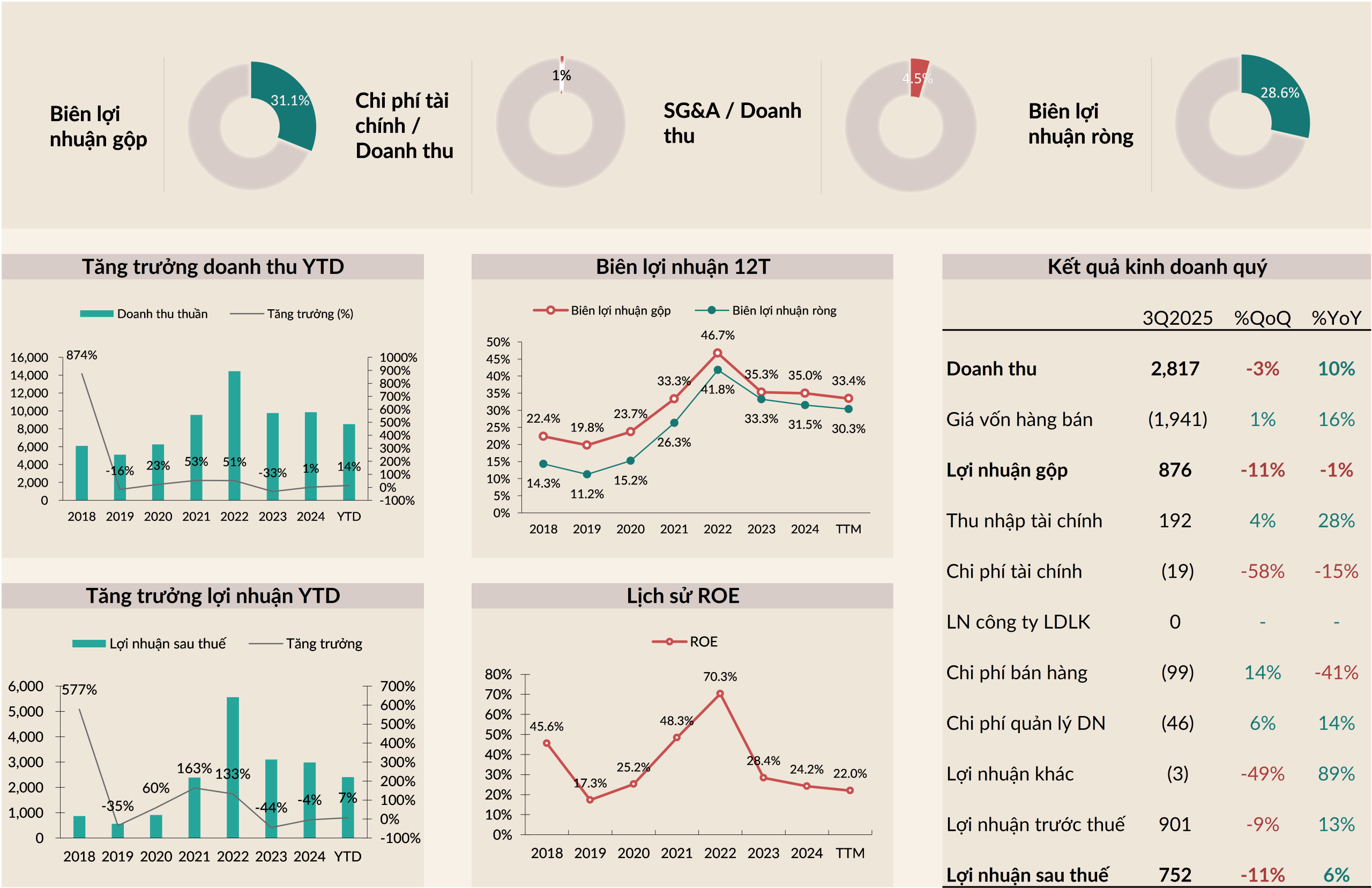 3Q2025, doanh thu đạt 2,817 tỷ VND, tăng 10% YoY. Lợi nhuận sau thuế đạt 752 tỷ VND, tăng 6% YoY. Lũy kế 9 tháng đầu năm, doanh thu đạt 8,521 tỷ VND, tăng 14% YoY; LNST đạt 2,403 tỷ VND, tăng 7% YoY.
