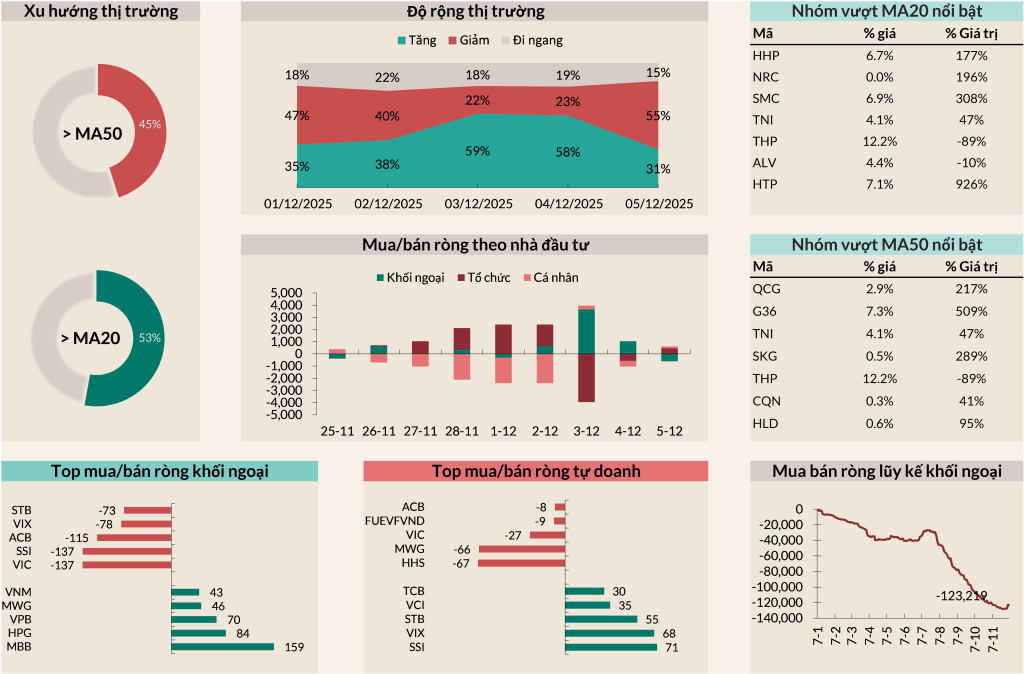 - Độ rộng thị trường có sự cải thiện đáng kể, đà hồi phục lan rộng ở nhiều cổ phiếu với số mã > MA20 chiếm 53% và >MA50 chiếm 45%. Tuy nhiên thanh khoản tiếp tục ở mức thấp ~ 25,000 tỷ VND/phiên.