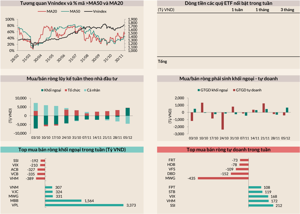 - Điểm tích cực đến từ khối ngoại đã quay trở lại mua ròng 4,419 tỷ VND sau nhiều tuần bán ròng liên tiếp, trong đó MBB và VPL được mua nhiều nhất. Ở chiều ngược lại, VHM, VCB, ACB, VIX và SSI bị đẩy mạnh bán ròng.
