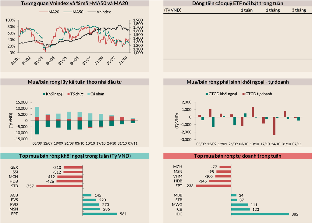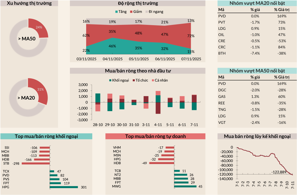 - Thị trường có dấu hiệu gãy trend khi với số mã > MA20 chỉ chiếm 31% và >MA50 chiếm 24%.