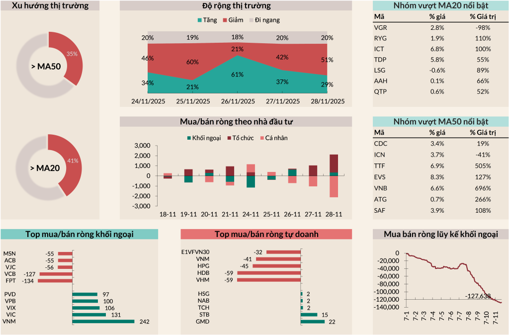- Độ rộng thị trường ở mức vừa phải với số mã > MA20 chiếm 41% và >MA50 chiếm 35%, thanh khoản tiếp tục ở mức thấp ~ 25,000 tỷ VND/phiên.