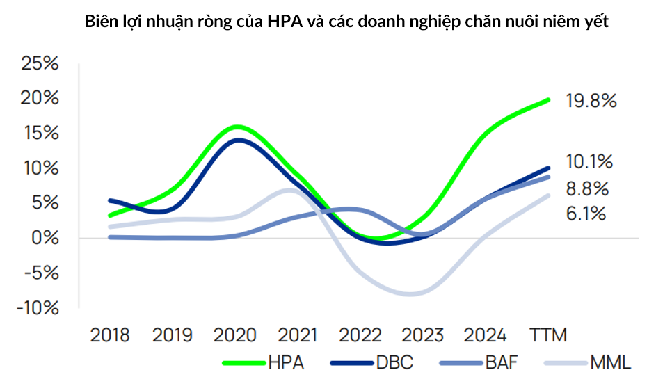 Trong giai đoạn 2018 – nay, biên lợi nhuận của HPA luôn cao hơn phần lớn đối thủ, đặc biệt nổi bật trong năm 2024–2025 khi biên LN phục hồi mạnh theo chu kỳ giá heo.