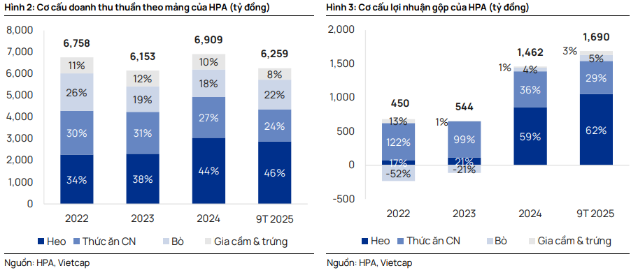 Trong đó, chăn nuôi heo đóng vai trò trung tâm, đóng góp 45% doanh thu và 60% lợi nhuận gộp giai đoạn 2024 – 2025. Mảng thức ăn chăn nuôi đứng thứ hai với khoảng 25%.