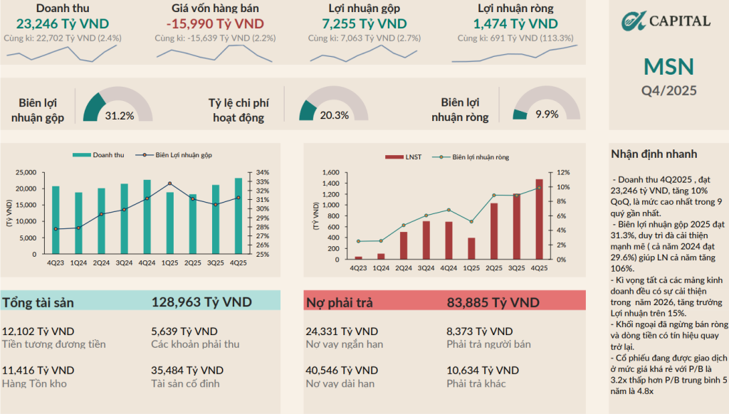 - Động lực 2026 đến từ vận hành: MCH hồi phục sau tái cơ cấu, WCM tăng trưởng tốt và có lãi, MHT cải thiện nhờ cắt chi phí; BLĐ đặt kế hoạch DT +15–20%, LNST +7–17%.