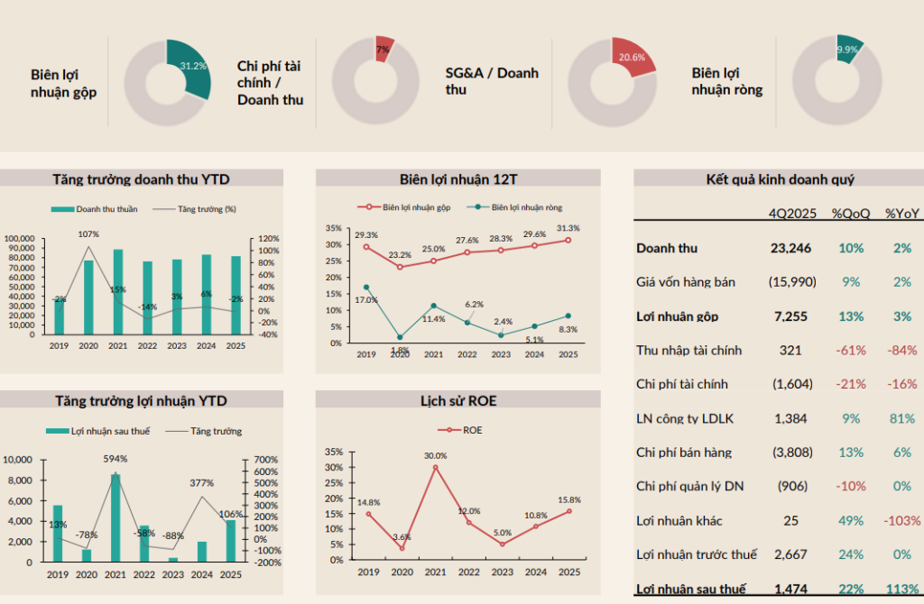 4Q2025, doanh thu đạt 23,246 tỷ VND, tăng 2% YoY. Lợi nhuận sau thuế đạt 1,474 tỷ VND, tăng 113% YoY. Lũy kế cả năm 2025, doanh thu đạt 81,621 tỷ VND, giảm 2% YoY; LNST đạt 4,108 tỷ VND, tăng 106% YoY.