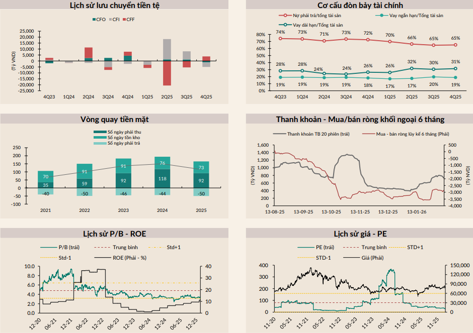 - Câu chuyện định giá & dòng tiền: khối ngoại chững bán (6 tháng ~3,000 tỷ VND), kỳ vọng từ SK thoái vốn; cổ phiếu đang ở P/B 3.2x thấp hơn trung bình 5 năm 4.8x → upside 2026 hấp dẫn.