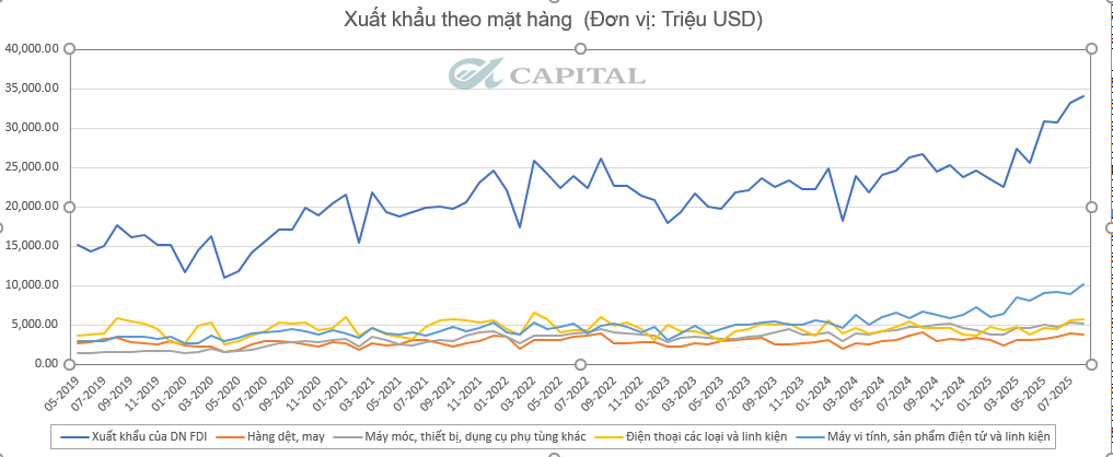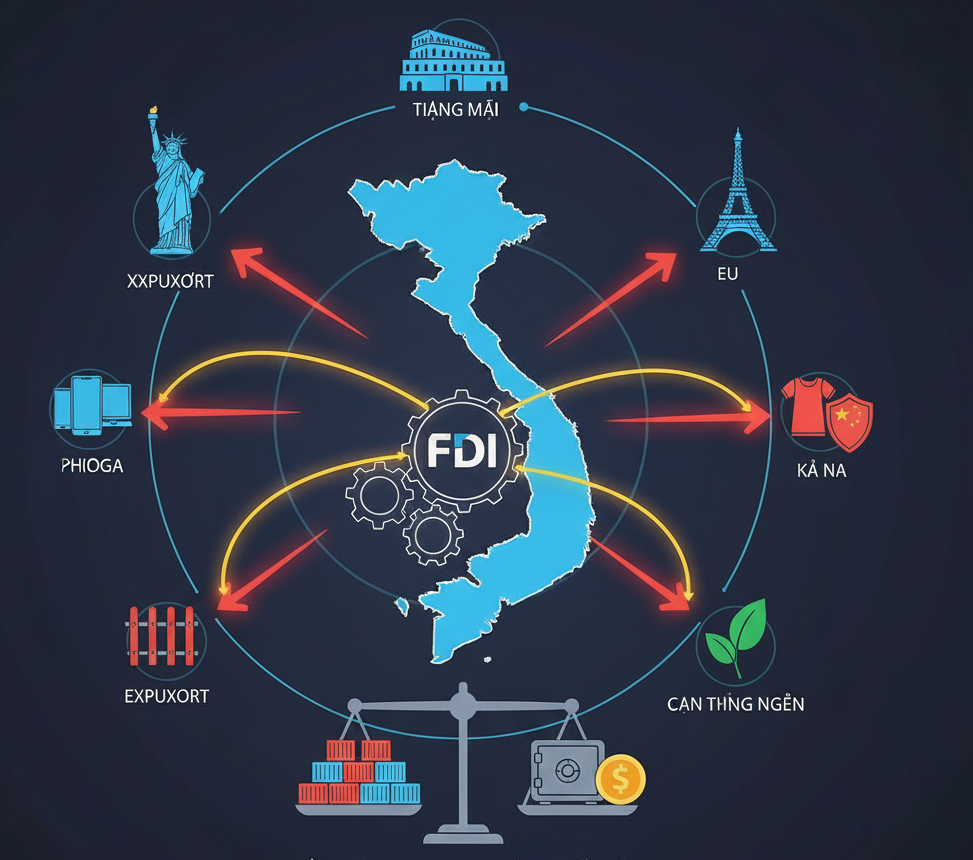 Khu vực FDI chiếm ~72% xuất khẩu lũy kế giữa tháng 3/2025; các ngành “đầu kéo” như điện thoại, máy tính, máy móc… chủ yếu do khối FDI dẫn dắt. Khi đơn hàng toàn cầu thay đổi địa điểm/chuỗi cung ứng, dòng sản xuất có thể dịch chuyển theo lợi ích tập đoàn, làm gia tăng biến động cho xuất khẩu Việt Nam.