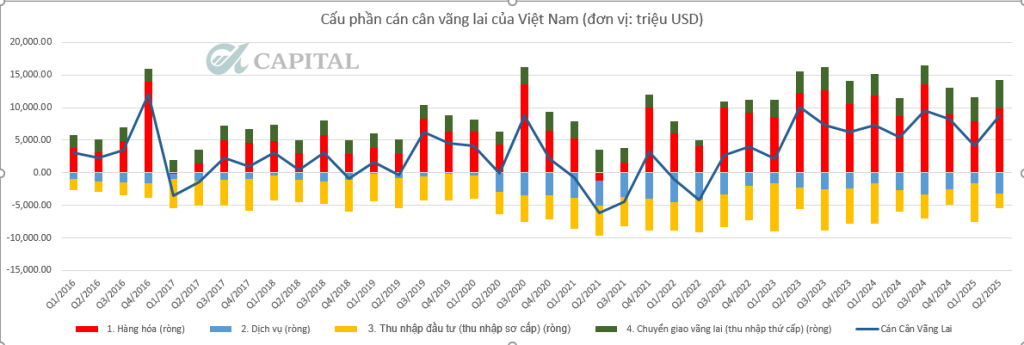 Trên cán cân thanh toán (BoP) chi phối “bài toán bù đắp”: Thâm hụt vãng lai chỉ có thể bù bằng dòng vốn vào ròng đủ lớn (FDI, vốn gián tiếp) hoặc bằng việc sử dụng dự trữ ngoại hối của Ngân hàng Nhà nước.