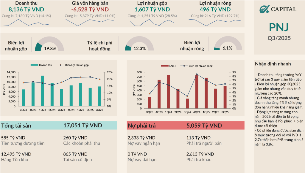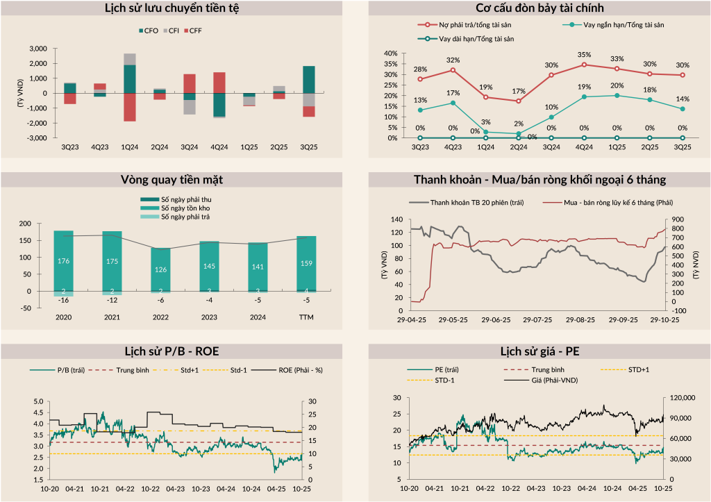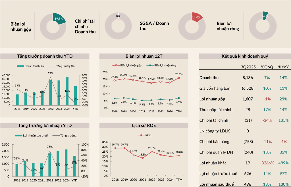 3Q2025, doanh thu đạt 8,136 tỷ VND, tăng 14.1% YoY. Lợi nhuận sau thuế đạt 496 tỷ VND, tăng 130% YoY. Lũy kế 9 tháng đầu năm, doanh thu đạt 25,353 tỷ VND, giảm 13% YoY; LNST đạt 1,610 tỷ VND, tăng 16.5% YoY.