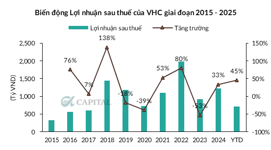 2Q2025, VHC ghi nhận kết quả kinh doanh tích cực với doanh thu đạt 3,192 tỷ VND, giảm 0.1% và LNST đạt 539 tỷ VND, tăng 58.6% YoY. Lũy kế 1H2025, LNST đạt 751 tỷ VND, tăng 41.9% YoY.