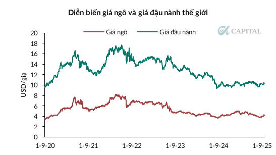 - Ngô giao động ở vùng giá thấp ~ 4.7 USD/giạ do kì vọng vụ mùa ở Mỹ năm 2025 năng suất cao cùng với vụ mùa Nam Mỹ thuận lợi khiến thị trường dự báo kịch bản dư cung nhẹ. Cho phần còn lại của năm và năm 2026, World Bank và IGC đều có dự báo giá ngô tiếp tục duy trì ở nền thấp do năng suất ở Mỹ và Brazil tốt và lượng hàng tồn kho lớn.
