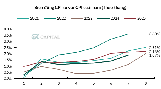 - CPI 8 tháng 2025 tăng ~3,25%, lạm phát cơ bản ~3,19% – nhìn chung dưới mục tiêu 4,5–5%. Tính lũy kế từ đầu năm, CPI chỉ tăng 2.18%, thấp hơn năm 2021 và 2022.