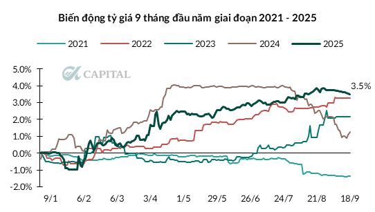 - Trong tháng 8/2025, tỷ giá USD/VND đã leo lên vùng 26.400 VND/USD, mức kỷ lục. Mặc dù đã có điều chỉnh sau khi FED có quyết định giảm lãi suất, tuy nhiên mức tăng 3.5% so với đầu năm vẫn là mức cao nhất trong giai đoạn 2021 – 2025.